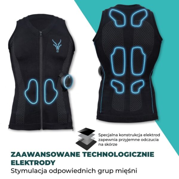 Odzież EMS Antelope została zaprojektowana tak, aby idealnie odpowiadać męskiej budowie ciała. Anatomicznie rozmieszczone elektrody zwiększają skuteczność treningu, zapewniając optymalną stymulację mięśni.